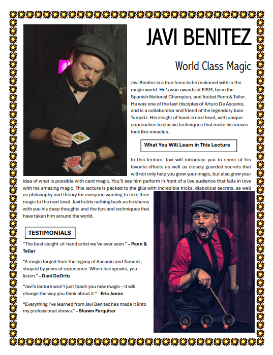Javi Benítez, the Spanish magician from the historic city of Seville, is not only a FISM World Champion in Close-Up Magic—he is one of the most exceptional and poetic performers in the world today. Known for his unparalleled sleight-of-hand, deep artistic compositions, and enchanting flamenco spirit, Javi captivates audiences across the globe. His televised performances have gone viral, earning him millions of views and international acclaim.